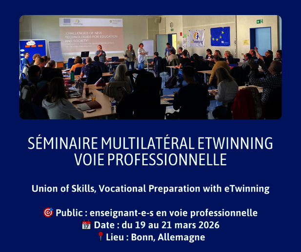 Intitulé Union of Skills, Vocational Preparation with eTwinning, ce séminaire, organisé en anglais, s’adresse aux enseignant·e·s de la voie professionnelle souhaitant découvrir eTwinning, rencontrer des partenaires européens et poser les bases d’un futur projet collaboratif.