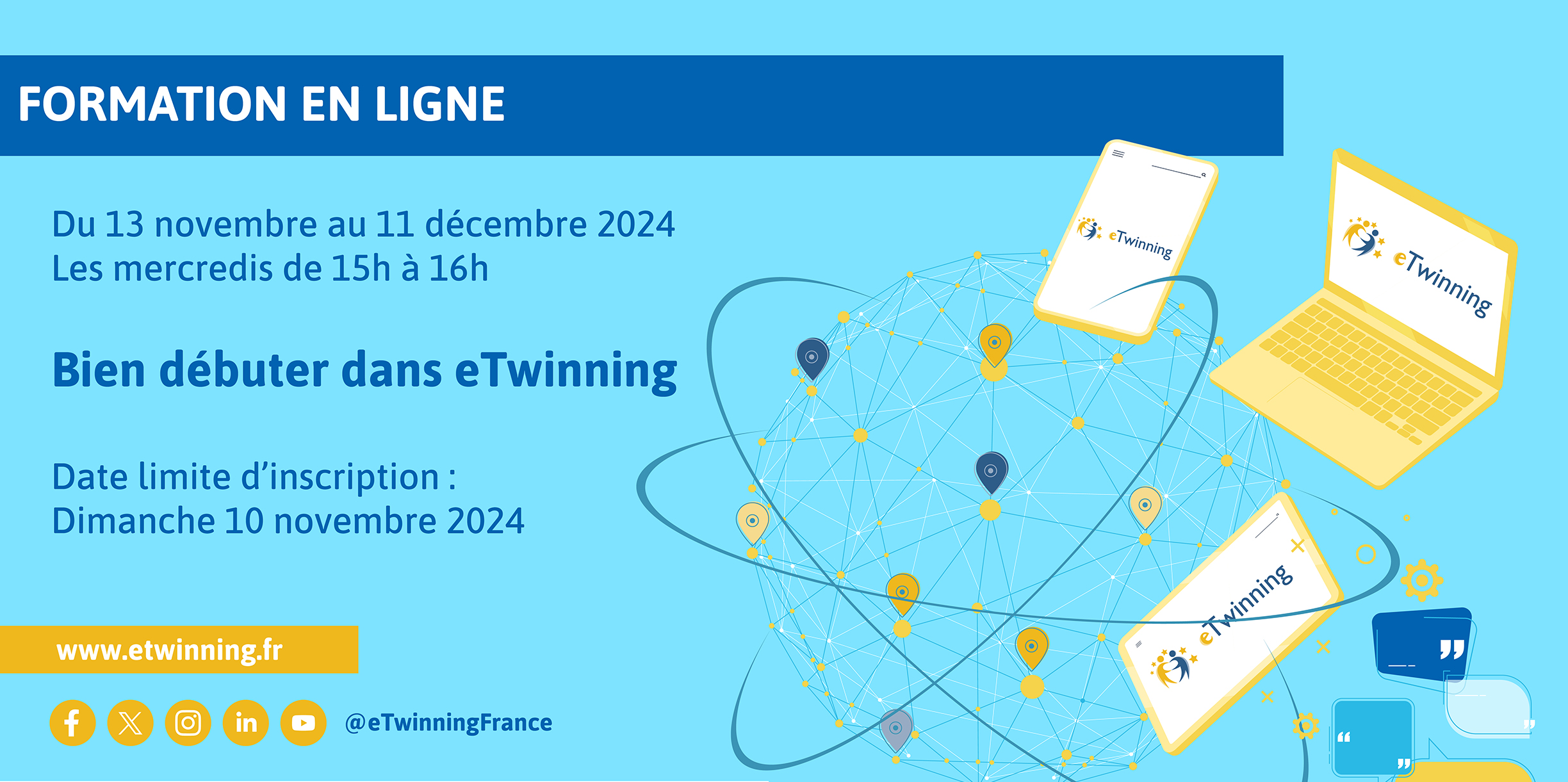 Cette formation pour bien débuter dans eTwinning est à destination d’enseignants de la maternelle à la terminale, toutes disciplines, et se déroulera en français. La démarche de projet est la même pour tous les niveaux, mais ce sera à vous de concevoir le contenu de votre projet, en fonction de vos besoins et du profil de vos élèves.