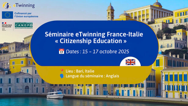 Ce séminaire bilatéral, organisé en anglais, réunira des enseignants italiens et français pour travailler ensemble sur des projets autour de l’éducation à la citoyenneté, en lien avec la thématique annuelle eTwinning 2025.