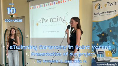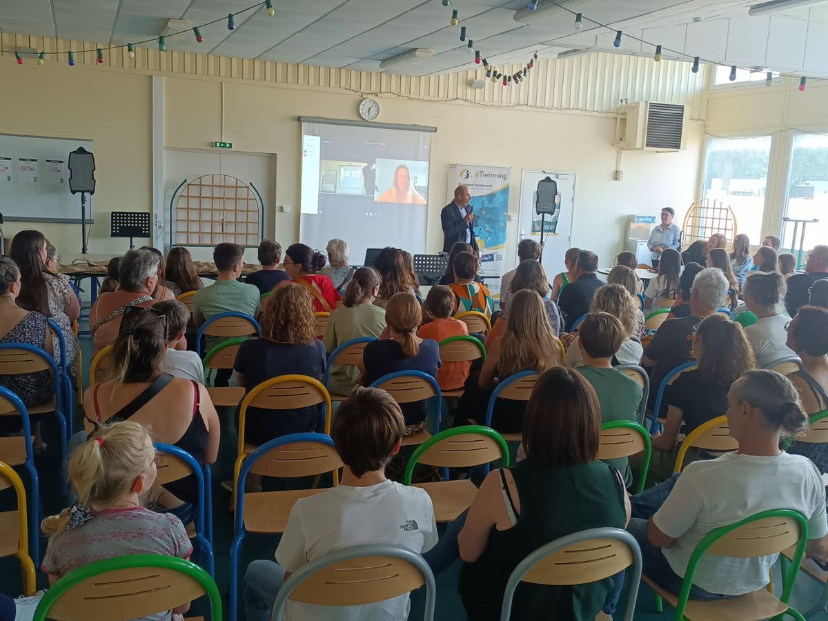 - Cérémonie eTwinning au collège français avec parents, élèves, professeurs, maire, journalistes + professeure d'Allemagne présente en visioconférence