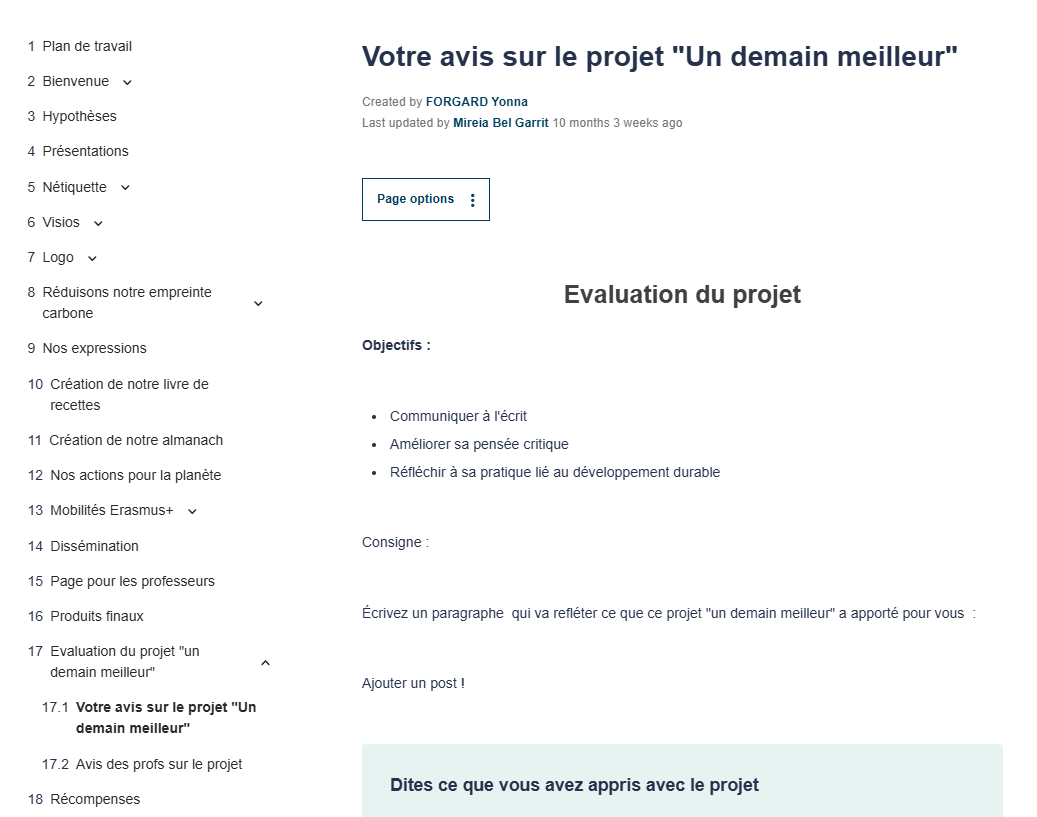 Le projet « Un demain meilleur » a permis à des élèves et des professeurs d’onze lycées différents de travailler ensemble sur le thème de l’environnement et sur comment diminuer son empreinte carbone afin de protéger la planète. Les élèves ont fait connaissance en se décrivant d’une manière ludique, créé et voté pour le logo, réfléchi à la nétiquette. Ils ont rédigé collaborativement des recettes avec les fruits et légumes de saison et les ont compilées dans un livre numérique. Le but du livre de recettes est de donner des idées pour consommer les fruits et les légumes de saison et de manger moins de viande pour baisser son empreinte carbone. Ils ont amélioré leurs compétences en langue, ont découvert certaines expressions utilisant les fruits, les légumes sous forme de devinettes en recherchant l’expression avec une illustration. Les productions finales sont la création d’un livre collaboratif regroupant nos règles sur internet, un livre de recettes et un almanach.