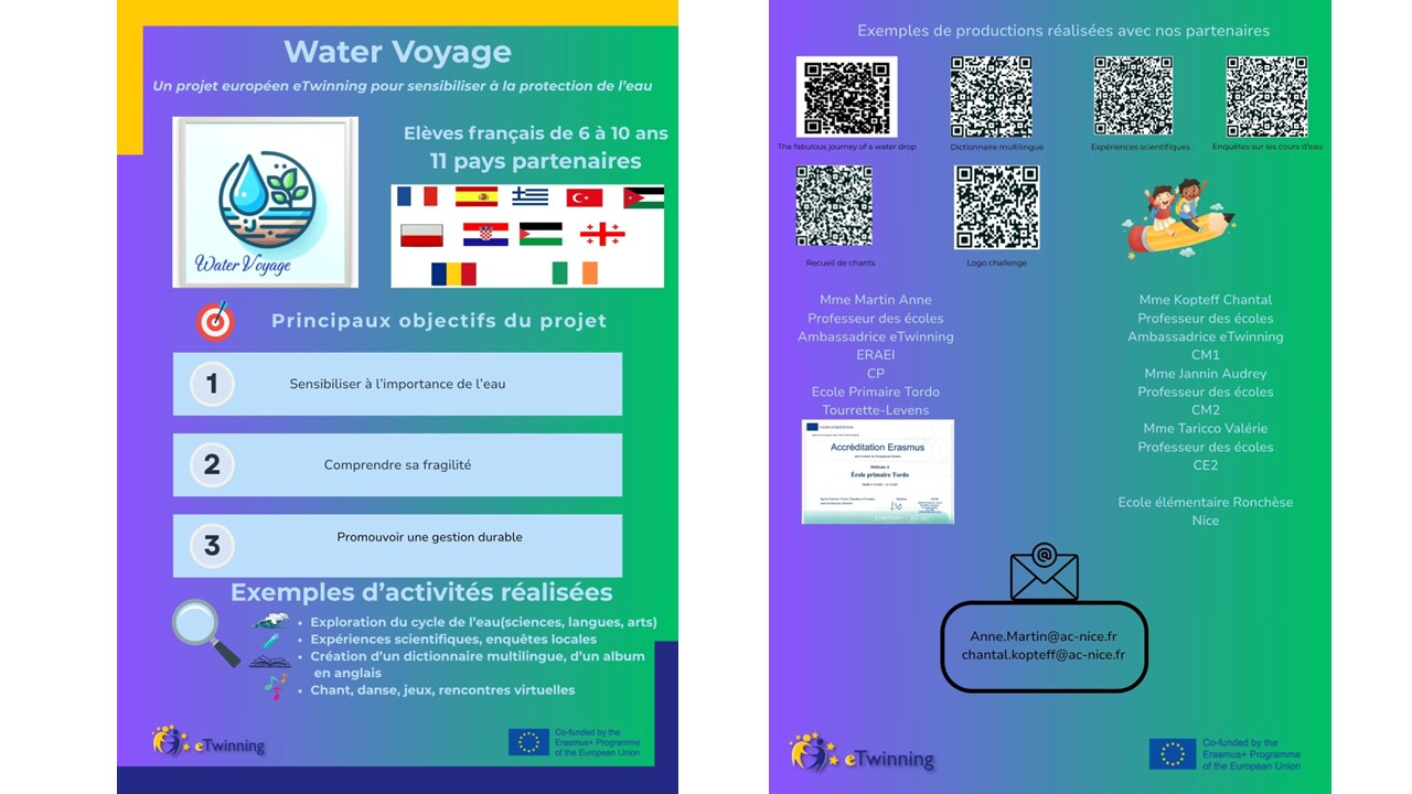Le projet eTwinning « Water Voyage » rassemble des élèves de primaire (entre 7 à 15 ans) de 12 pays pour les sensibiliser l’importance de l’eau, à sa fragilité et aux enjeux de sa gestion durable, tout en renforçant leurs compétences linguistiques, numériques et leur ancrage territorial.
