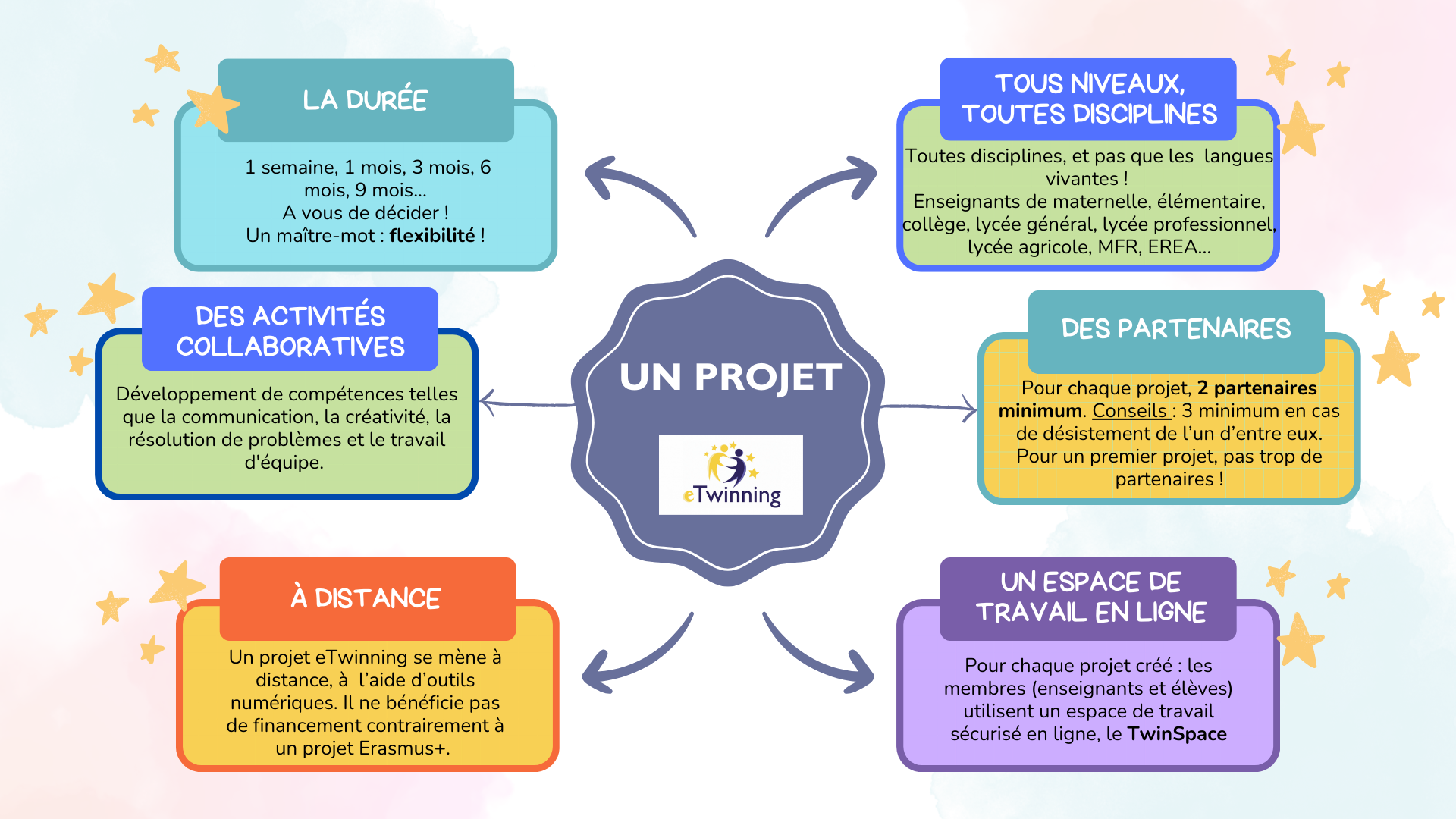 Un projet eTwinning est un projet de travail collaboratif mené à distance par au moins deux classes de pays européens différents, ou depuis 2014, par deux classes d'un même pays (établissements différents). En savoir plus sur "eTwinning national".