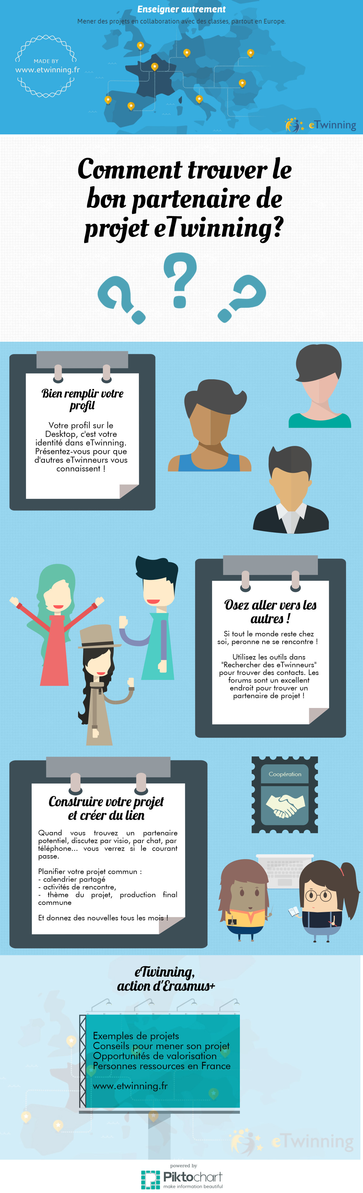 Info clé : Dans le cadre d'une expérimentation en 2014-16 vous pouvez mener un projet eTwinning entre partenaires français (en savoir plus sur eTwinning national).